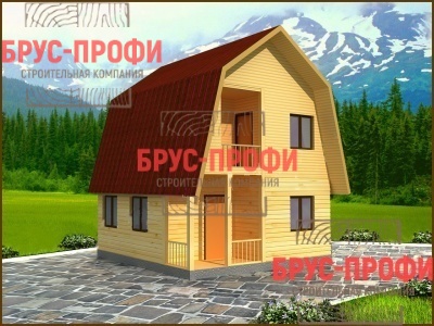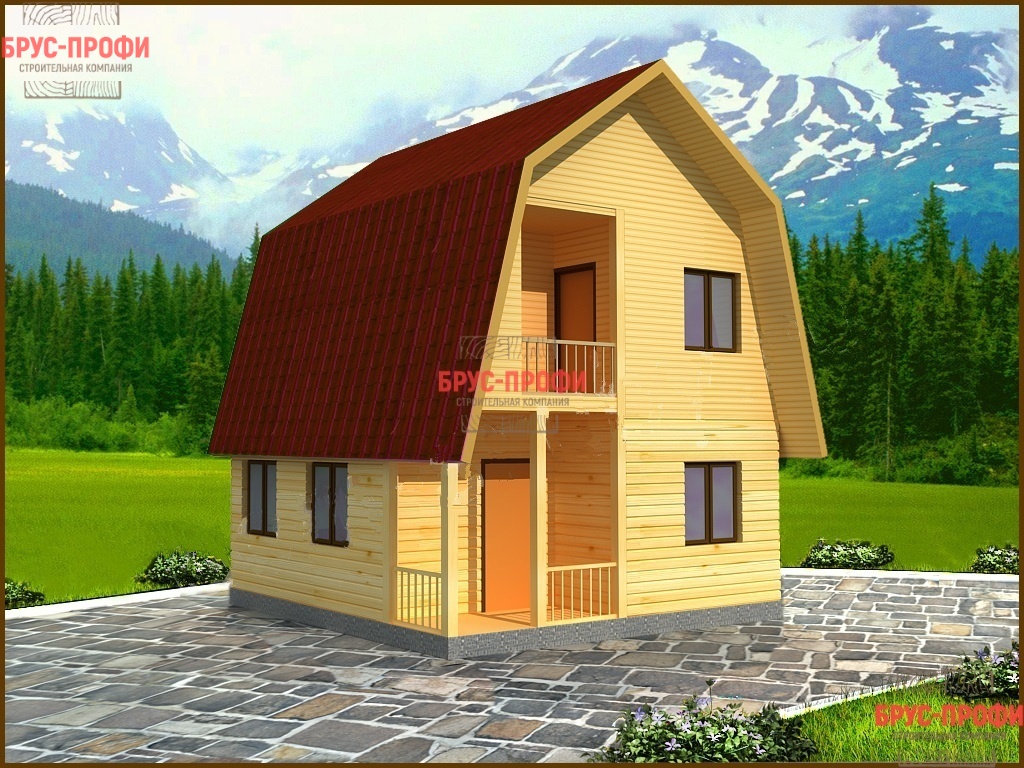 Экономичный по размерам деревянный дом, выполненный из бруса. Такой дом из бруса подходит для круглогодичного проживания и загородного отдыха. На первом этаже дома из бруса располагаются гостиная и кухня, а второй этаж занимает большая спальня. Данный проект дома не займет много место на участке и оставит свободное пространство для цветов, деревьев и небольшого пруда с рыбками.