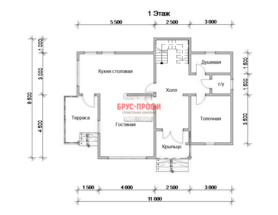 - Все перегородки 1 этажа — брус 100х150 мм.;