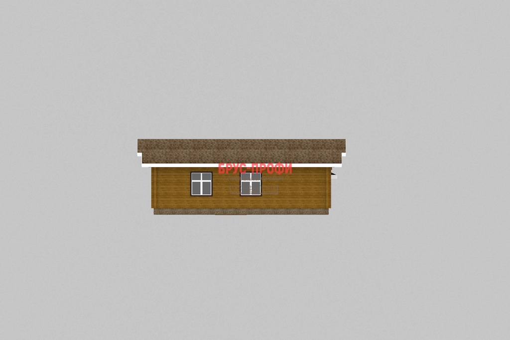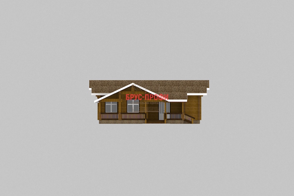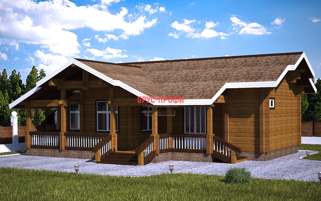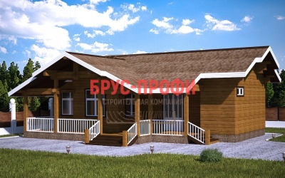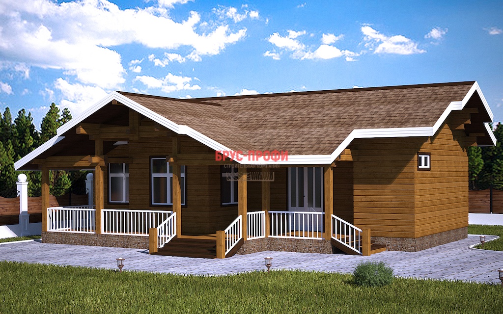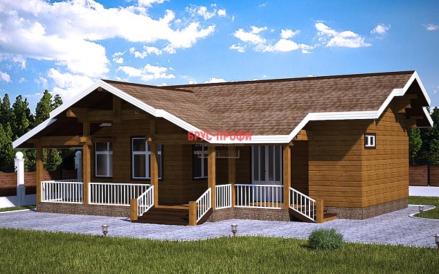 Постройка одноэтажная. Проектом предусмотрены просторная кухня – столовая, вместительная гостиная, две больших спальни. Также в доме есть сауна и санузел. Дом имеет два крыльца, с которых попадаешь на террасу, защищенную крышей. В летний период здесь могут играть дети, кроме этого, ее можно использовать в качестве летней столовой, разместив небольшой стол с несколькими стульями. В проект дома, его комплектацию могут быть внесены изменения, по желанию клиента.